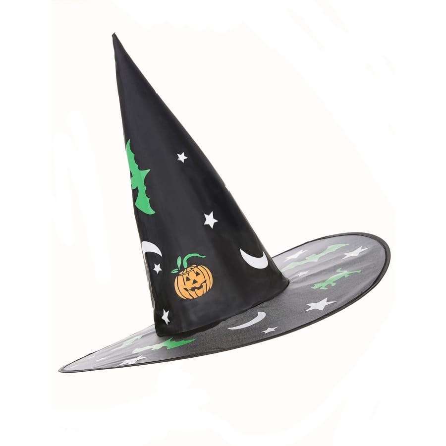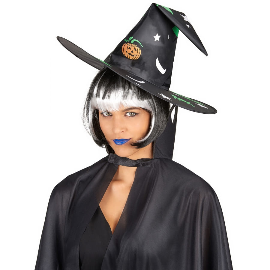 Accessoirisez votre déguisement de sorcière, et sentez la magie noire avec ce chapeau pointu noir avec imprimés Halloween pour adulte.