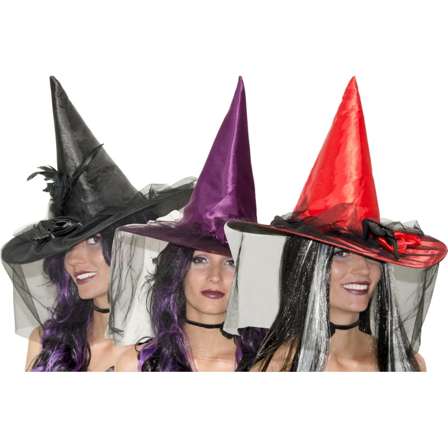 Très joli chapeau de sorcière pointu en satin de luxe, pour femme. Cet accessoire comporte des plumes noires et une voilette semi-transparente assortie qui recouvre le visage complètement. Il vous sera impossible de choisir la la couleur au moment de la commande et vous recevrez donc un des modèles présentés: le noir, le rouge ou le violet. Il est un accessoire indispensable pour un déguisement de sorcière réussi.