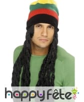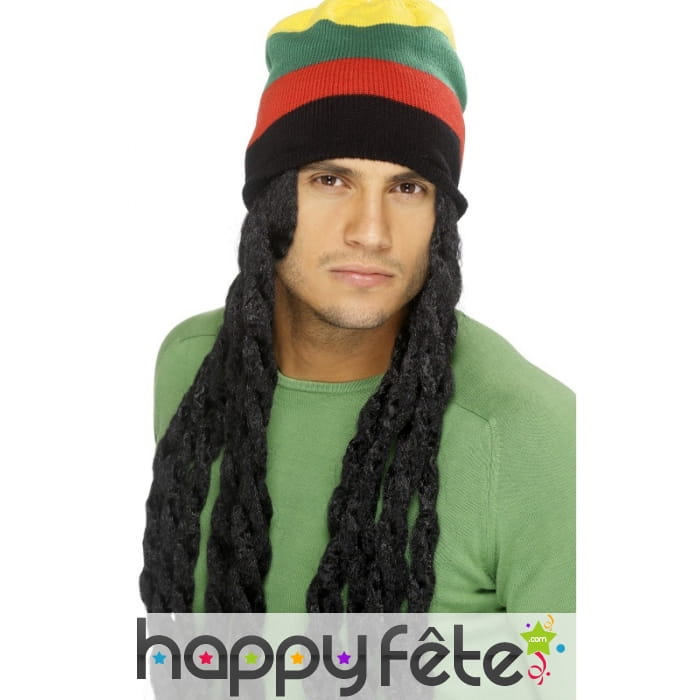 Bonnet de rasta, à rayures de couleur verte, jaune, rouge et noire, pour homme ou adolescent. Ce petit accessoire servira à afficher votre style de musique ou pour vous déguiser en baba cool ou rasta pour une fête déguisée.