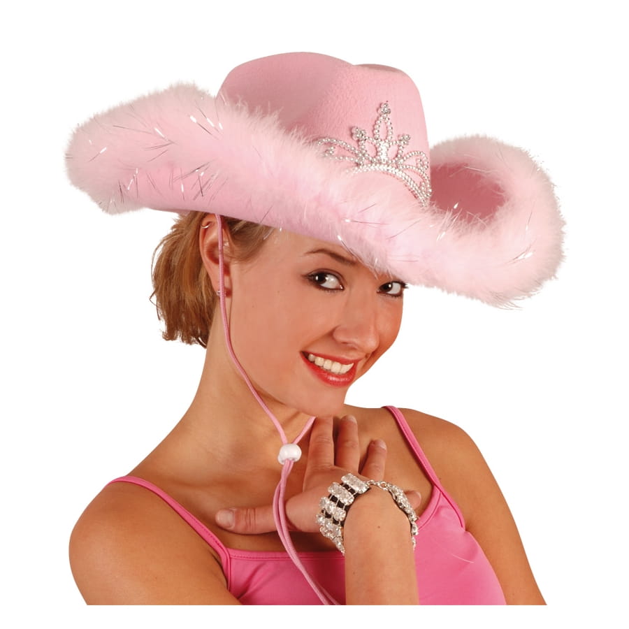 Mesdemoiselles, ce chapeau rose de cowgirl bord en froufrou vous aidera à compléter votre tenue pour la soirée prénuptiale.