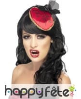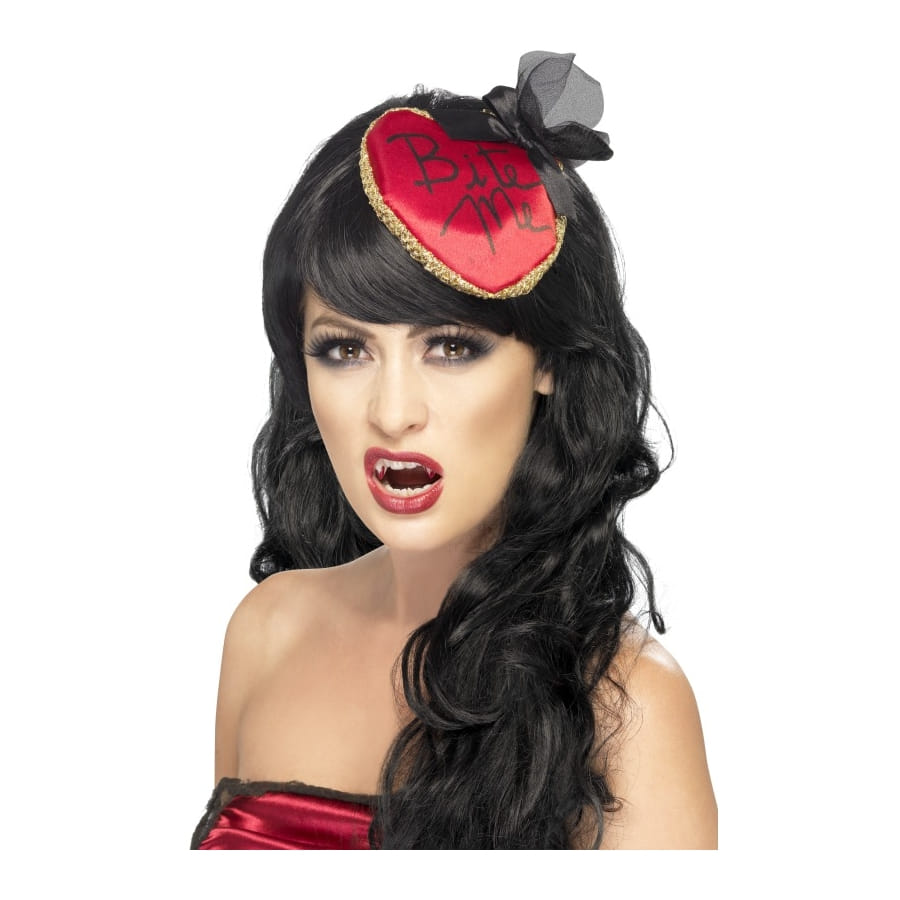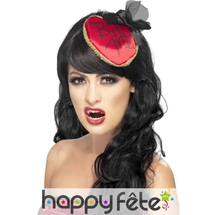 Chapeau de vampire de couleur rouge, noire et dorée, pour femme. Le chapeau est en forme de coeur rouge, imprimé d'un 'Bite Me' noir et orné d'une bordure dorée. Il est également agrémenté d'un noeud avec voile noirs. Vous pouvez l'utiliser pour un déguisement de femme vampire ou pour un style gothique lors d'un enterrement de vie de garçon ou de jeune fille.
