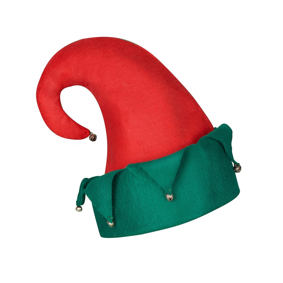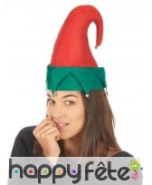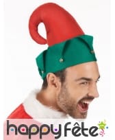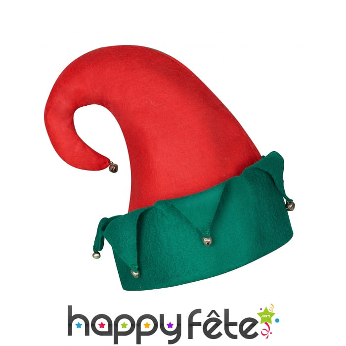 Il s'agit d'un bonnet en feutrine bicolore. Il est fait de rouge et de vert, des couleurs qui s'harmoniseront parfaitement avec votre tenue de noël. Le chapeau est recourbé au sommet et mesure 56 cm de tour de tête. De petits grelots décorent la coiffe de lutin et font un tour de tête de 59 cm.