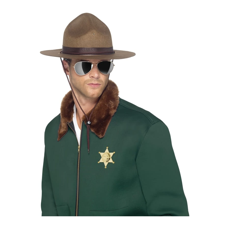 Chapeau de shérif de couleur brune, pour homme. Cet accessoire est orné d'un ruban assorti ainsi que d'un cordon. Pour incarner un personnage de shérif du conté, rien de plus approprié que ce chapeau.