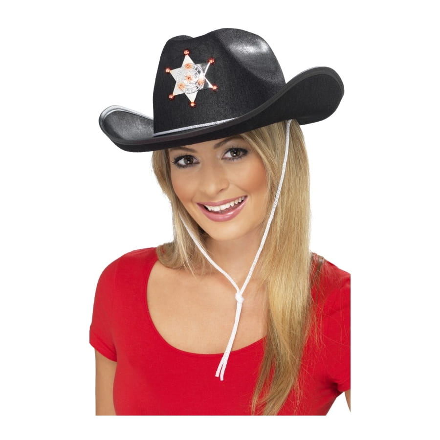 Chapeau de shérif de couleur noir, avec étoile argentée et cordon blanc, pour homme ou femme. Utilisez ce chapeau pour un déguisement de femme shérif sexy!