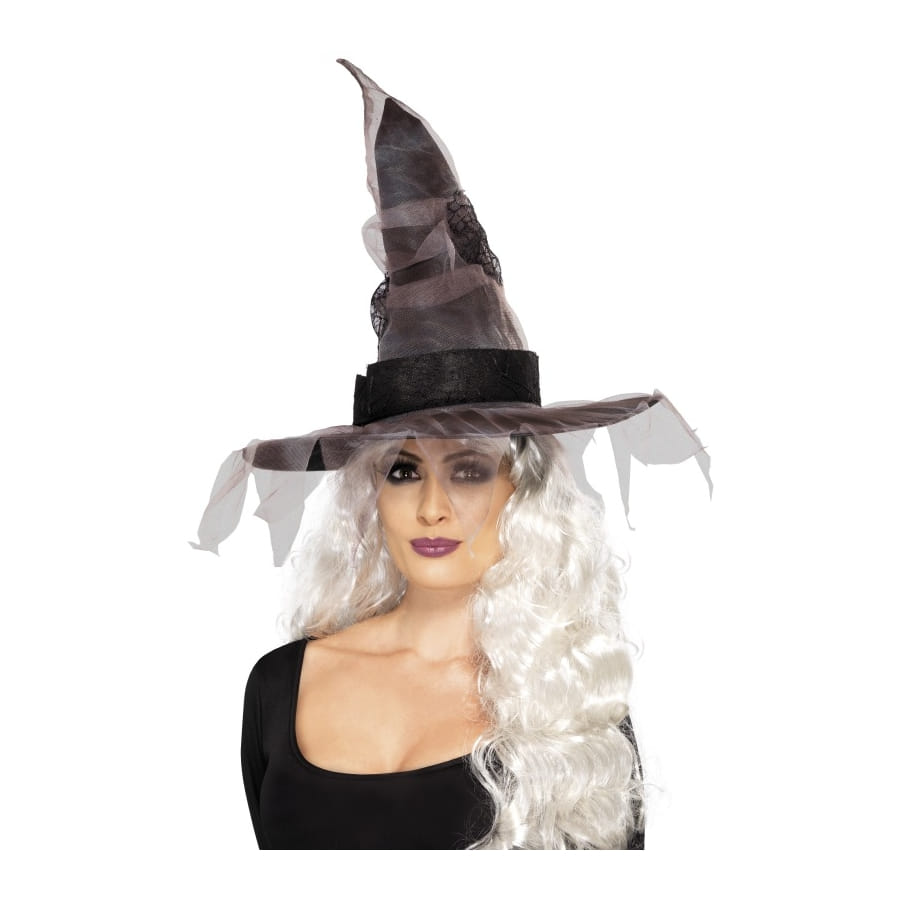 Long chapeau de sorcière pointu de couleur noire, avec voiles et ruban assortis, pour femme ou adolescente. Ce chapeau apportera une touche de mystère et de douceur à votre déguisement de sorcière.