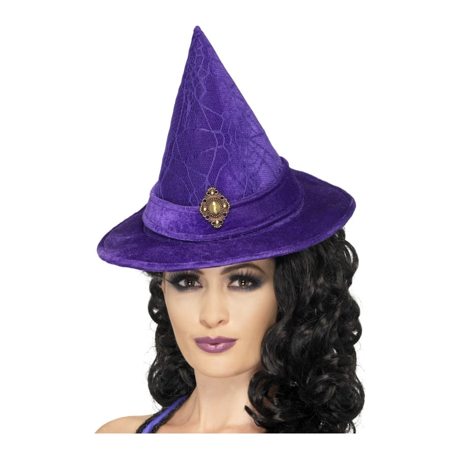 Chapeau de sorcière de couleur violette, pour femme. Cet accessoire, long et pointu, est décoré de toiles d'araignées assorties et d'une jolie broche dorée. Il vous donnera un air de sorcière très élégante à l'occasion d'une fête d'Halloween.
