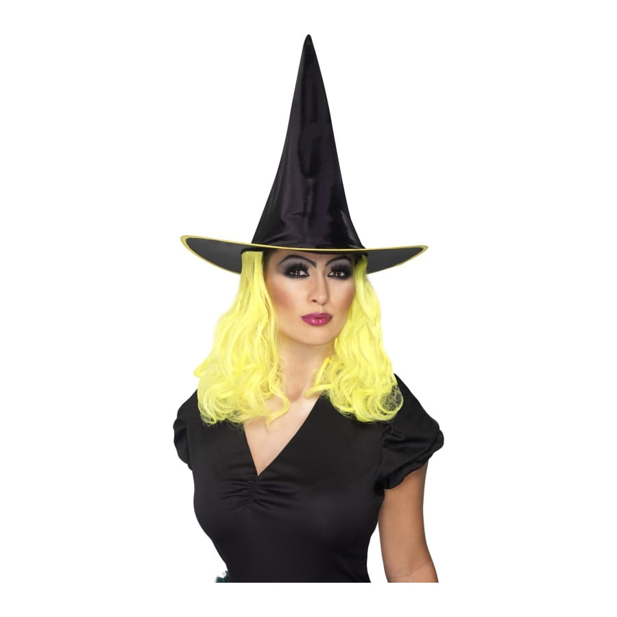 Chapeau de sorcière de couleur noire, avec cheveux jaunes inclus, pour femme ou adolescente. Posez cet accessoire sur votre tête pour instantanément vous transformer en sorcière, ou si vous le souhaitez, en fée.