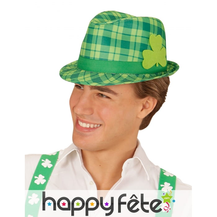 Le chapeau tartan irlandais avec trèfle est entièrement imprimé de carreaux verts.