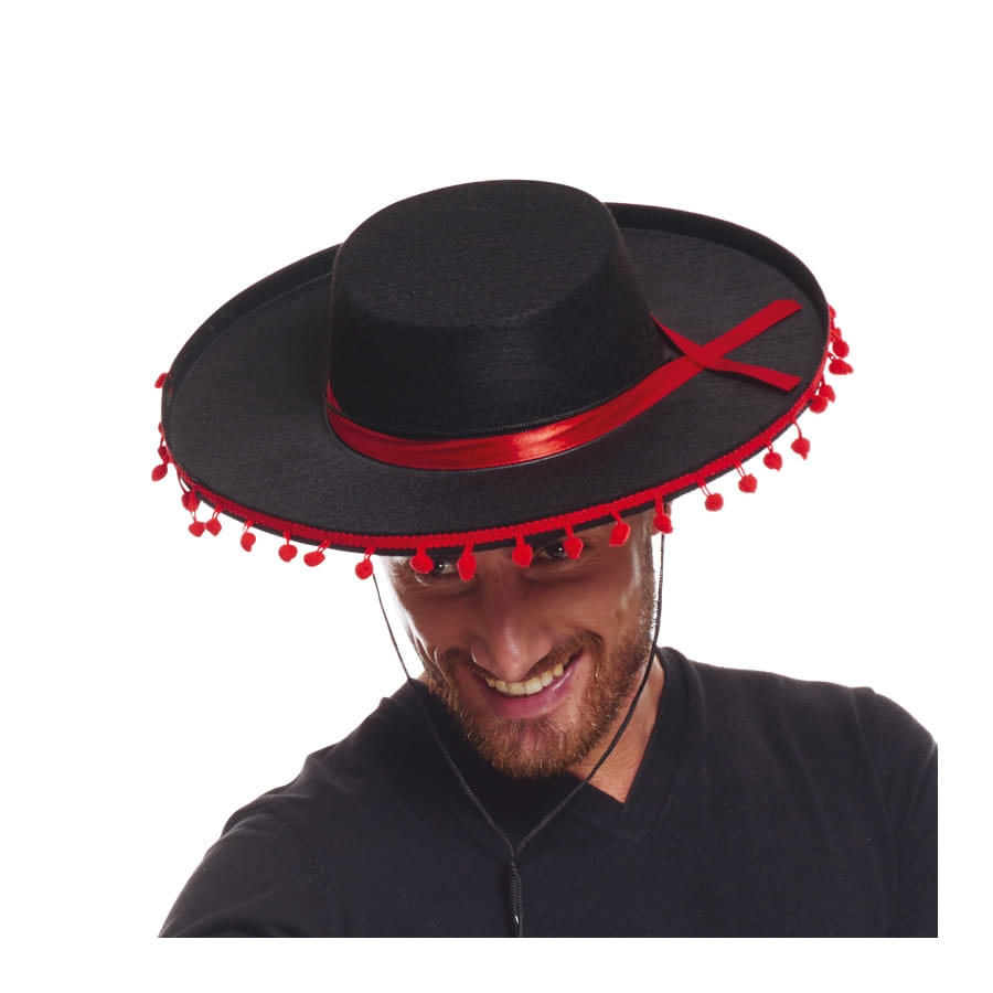 Ajoutez un accessoire inspiré de la culture espagnole pour embellir votre tenue de danseur. Avec ce chapeau traditionnel espagnol avec pompons rouges, vous allez virevolter sur la piste de danse ! Il s'agit d'un modèle à ficelle de couleur noire et orné d'un ruban rouge. Ses bords sont agrémentés d'une série de petits pompons rouges.