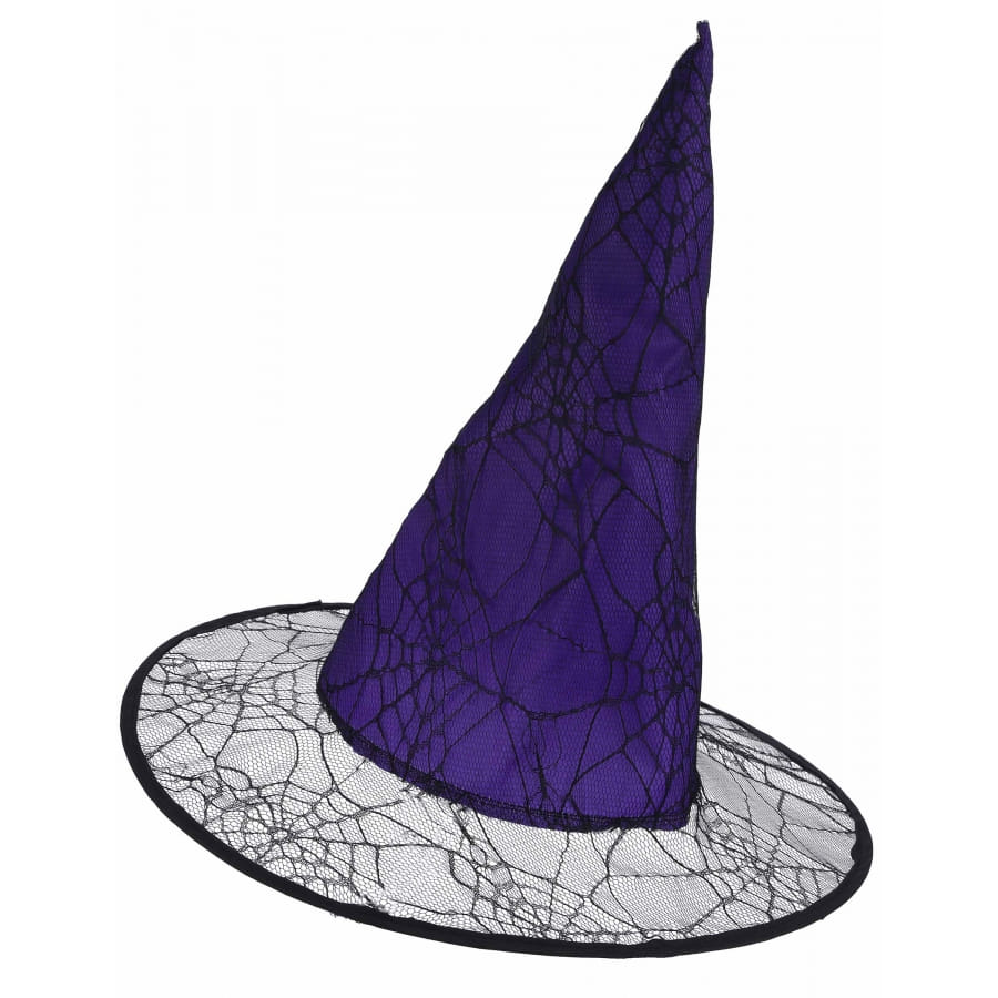 Le meilleur accessoire pour compléter un déguisement de sorcière à l'occasion d'un carnaval, de la soirée d'Halloween ou à une fête costumée est certainement ce chapeau violet pointu effet toile araignée pour adulte.