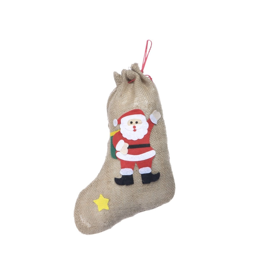 Cette déco chaussette de Noël en toile de jute mesure 43 cm de haut. Elle représente une chaussette en toile de jute beige agrémentée d'un petit Père Noël en train de saluer de la main. Vous n'avez qu'à la mettre au pied de votre sapin pour créer un décor parfait qui va ravir les grands et les petits. Happyfete vous souhaite un très joyeux Noël !