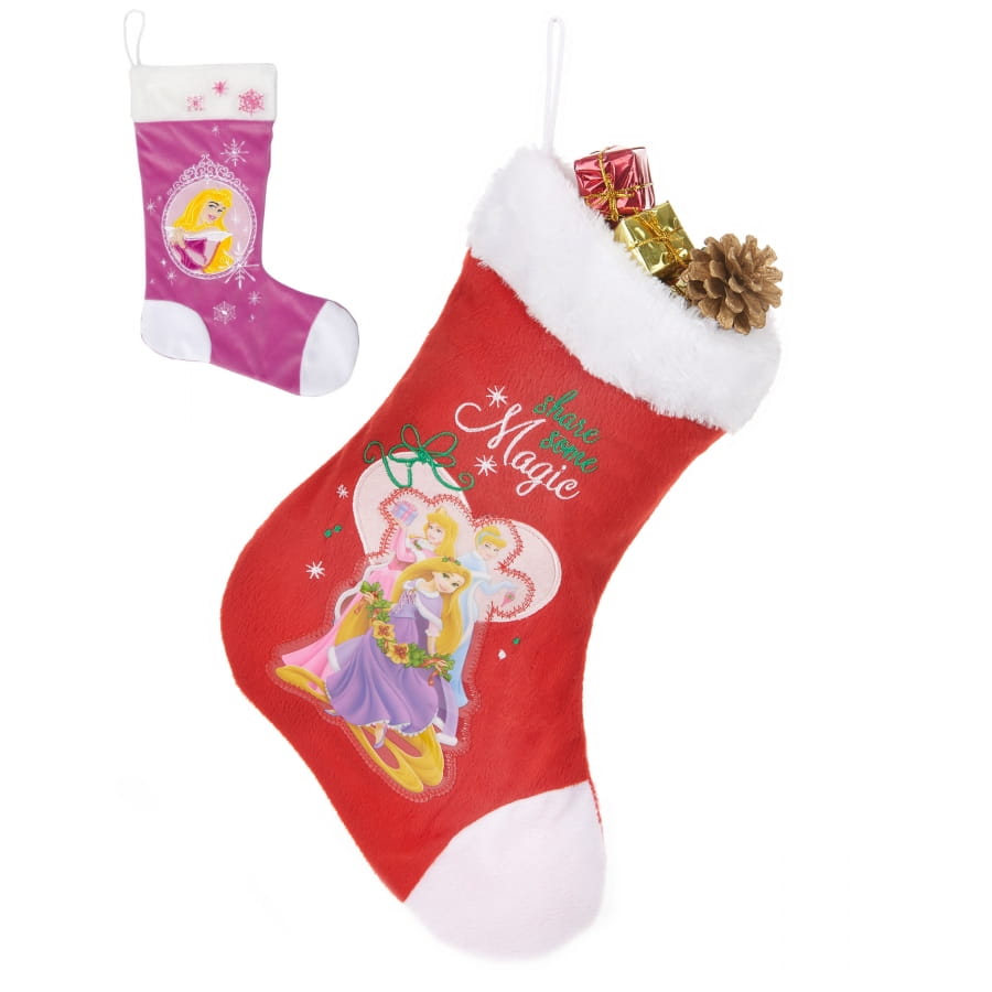 Invitez des princesses chez vous à l'occasion des fêtes de fin d'année. Il vous suffira de suspendre cette chaussette de Noël princesses Disney pour y glisser ensuite des petits jouets, des bonbons, ou toutes sortes de petits cadeaux. Ce modèle est sous licence Disney, de couleur rouge ou rose avec les images de Raiponce, Cendrillon, Aurore, etc. imprimées à l'avant,