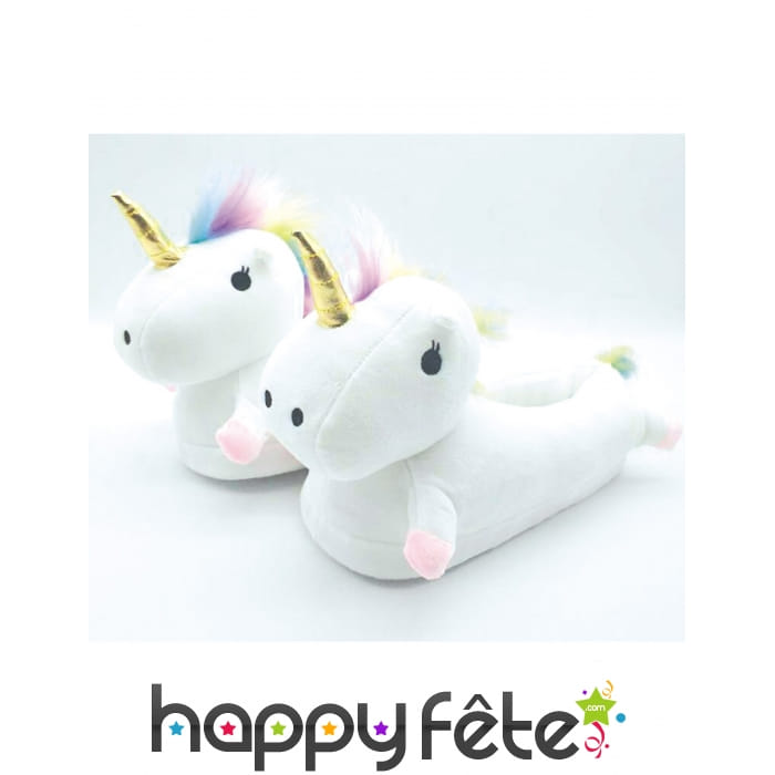 Ces chaussons de couleur blanche ont la forme de mignonnes petites licornes à la corne dorée à effet métallisé.
