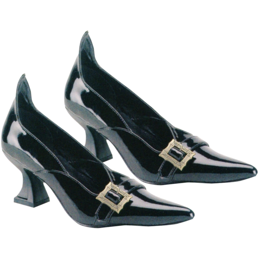 Paire de chaussures de couleur noire, pour femme. Elles sont entièrement en vinyle, pointues avec une jolie boucle pour les décorer. Au moment de votre commande, elles seront disponibles en pointure 37 ou 38. Ajoutez-y un de nos chapeaux pour compléter votre tenue de sorcière.