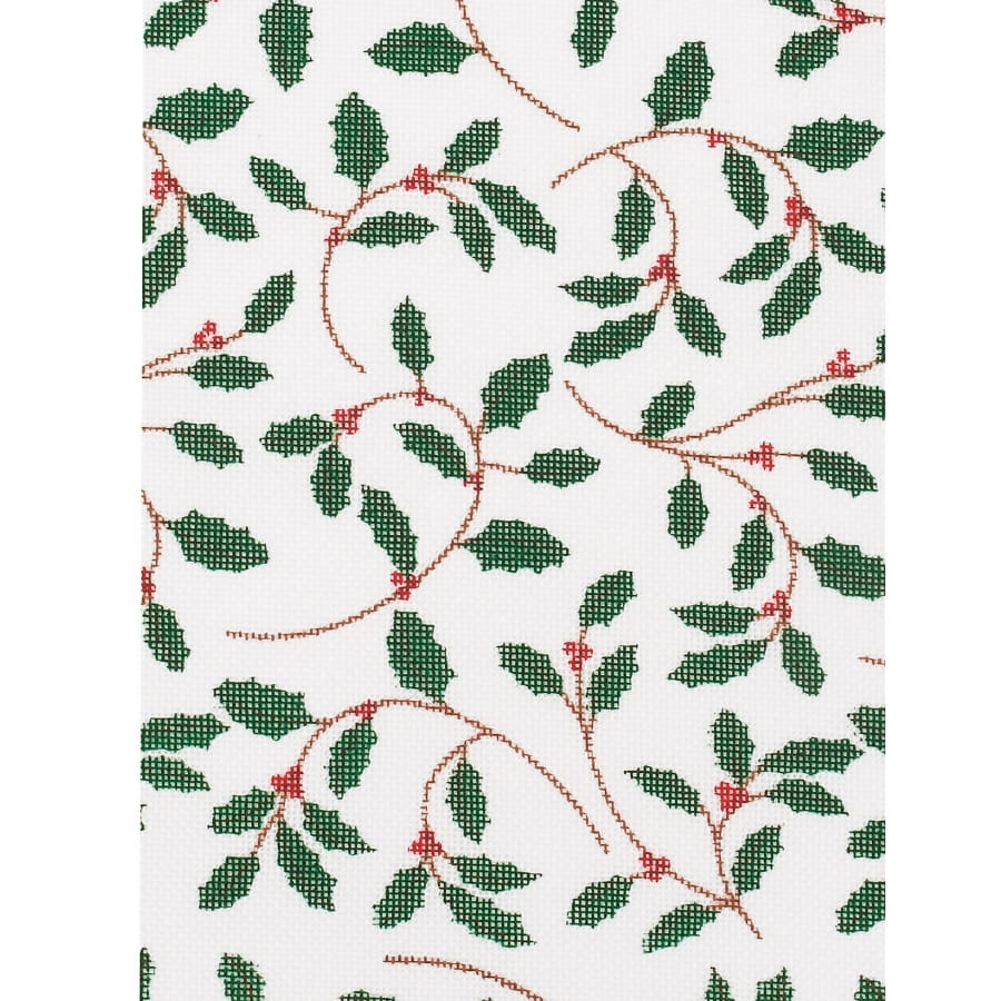 Des feuilles de houx vertes ainsi que des baies et des tiges rouges agrémentent le fond blanc.