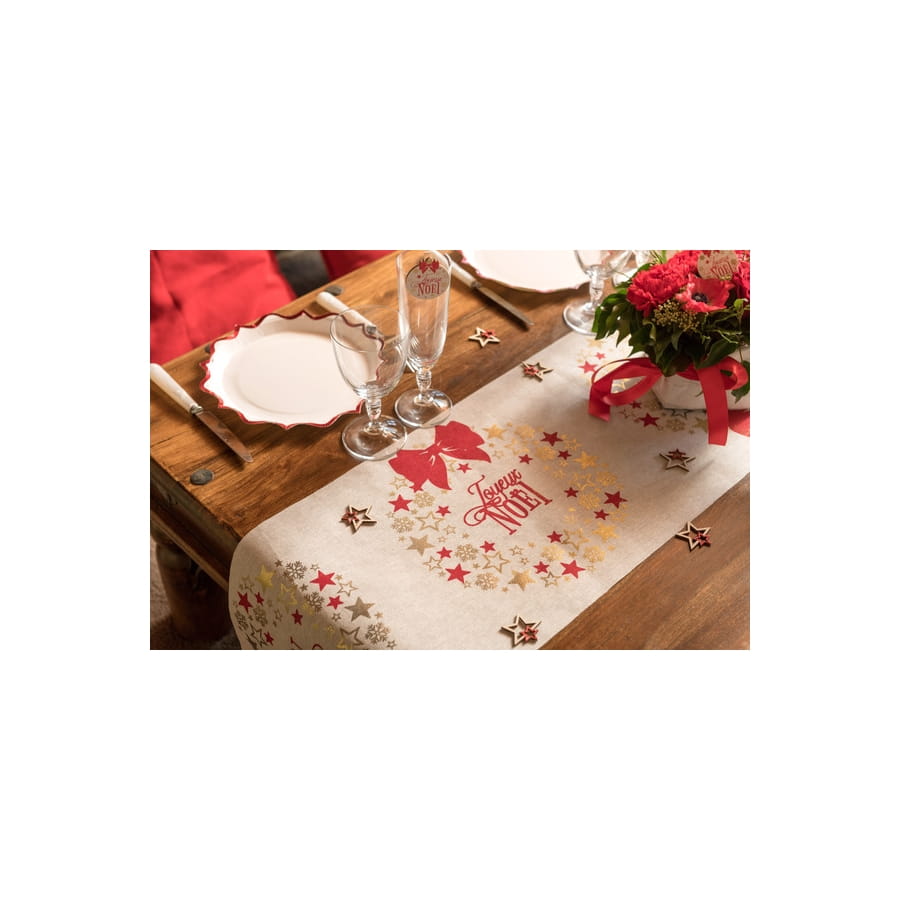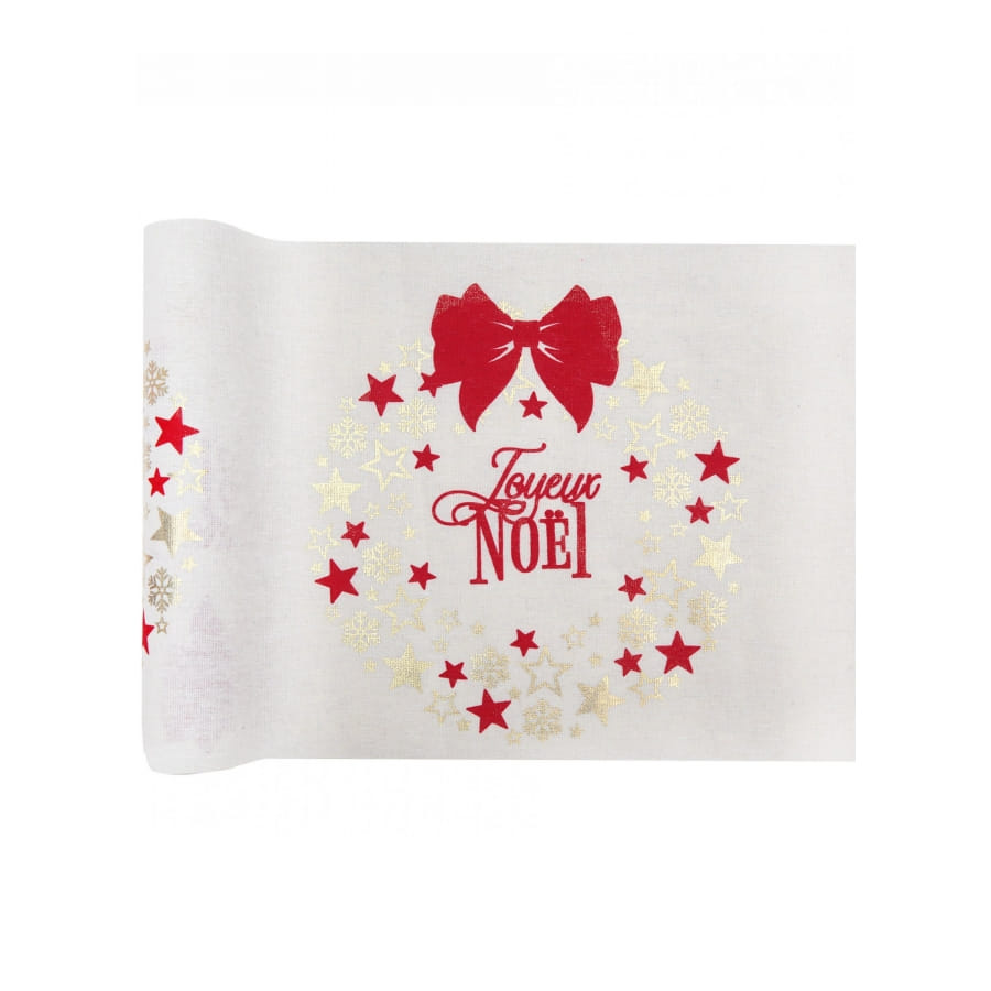 Ce chemin de table présente de jolis motifs sur un fond blanc. On retrouve des étoiles rouges et dorées, avec un grand noeud rouge sur le haut. Les étoiles et le noeud entourent les mots "Joyeux Noël" en rouge, au centre.