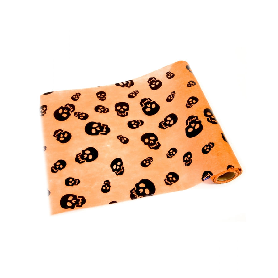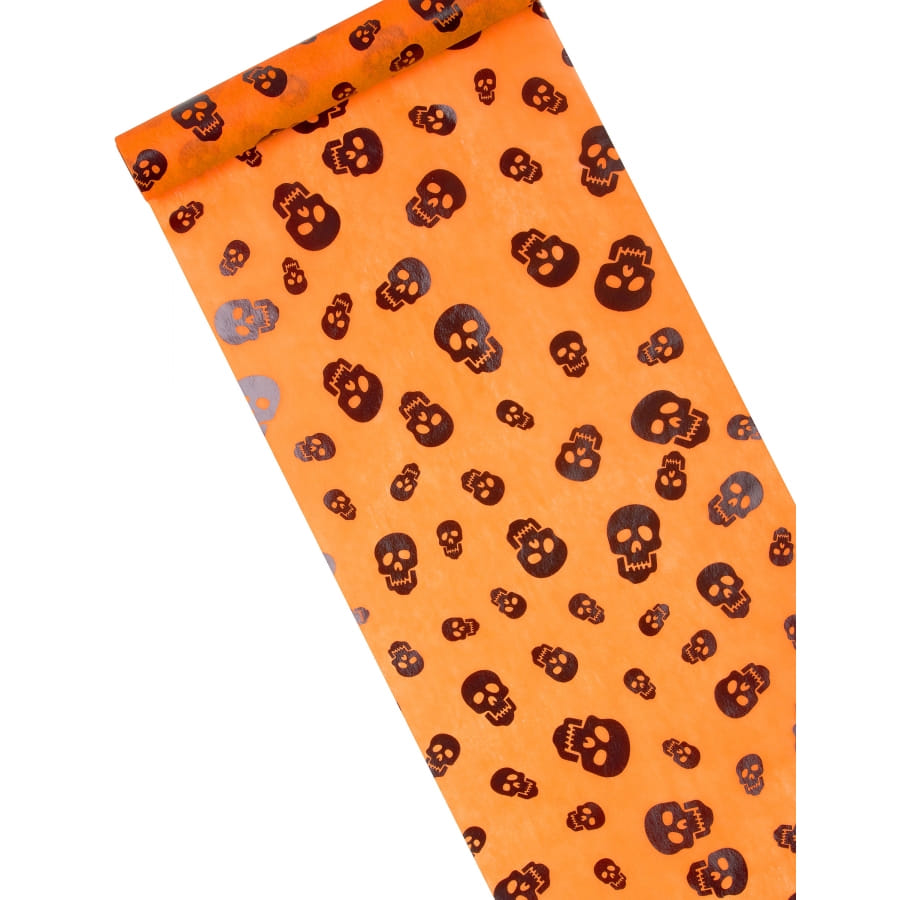 Compléter une déco Halloween avec notre chemin de table orange et têtes de mort 29cm x 5m.