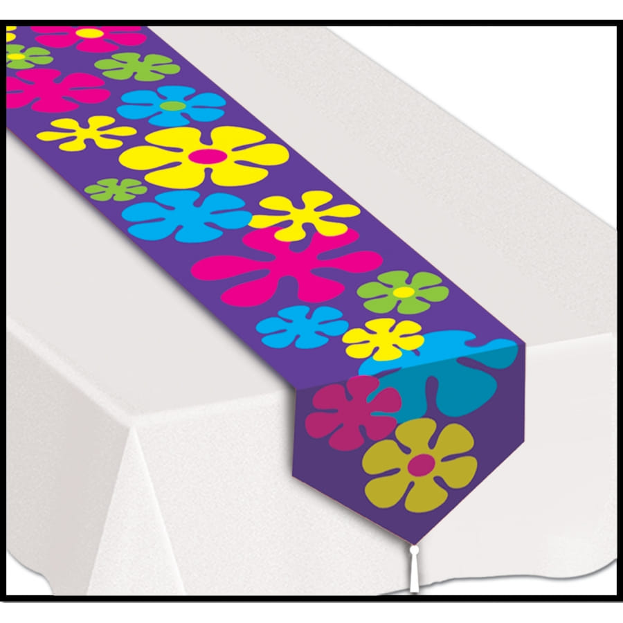 Une soirée hippie, c'est ce qu'il faut pour faire renaître notre côté "Peace and love"! Et lors de cette soirée, non seulement vous devez vous habiller suivant le thème, mais vous devez également décorer la salle de réception en circonstance. Même seulement les tables, avec ce chemin de table par exemple, qui mesure 27 cm x 150 cm. Ce chemin de table est parfait pour ce genre de thème, car c'est un assortiment de fleurs de couleur jaune, rose, verte et bleue, qui décore un fond violet.