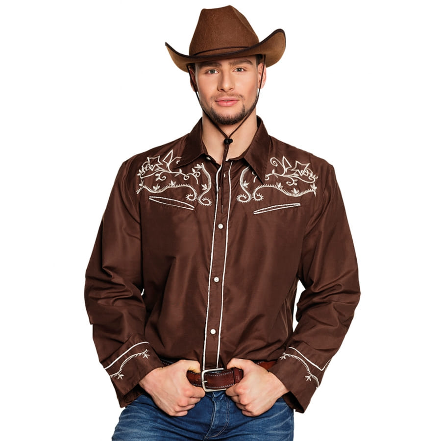 Qu'importe le déguisement que vous avez choisi, cette chemise FarWer marron et motifs blancs adulte sera adaptée.