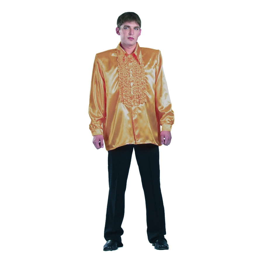 Cet accessoire de déguisement pour le carnaval sera ideal, vous pourrez incarner une star ou un danseur . Disponible en 50/52 et 54/56 . Cette chemise a ruches manche longue couleur or effet satiné vous serez élégant dedans.