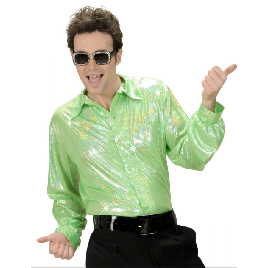 La chemise verte holographique disco pour homme est idéale pour briller lors de la Saint Patrick ou à l'occasion d'un soirée déguisée sur le thème des années 70.