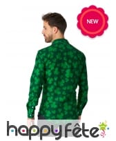 Cette chemise présente un fond vert foncé et des imprimés de feuilles de trèfle plus clairs sur toute la surface du vêtement.