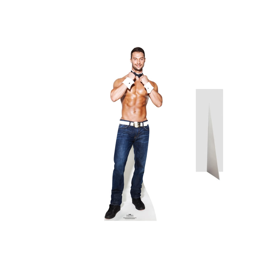 Cette silhouette Chippendale noeud papillon taille réelle en carton est un accessoire de décoration conçu pour décorer une pièce en vue d'une soirée à thème, ou bien une chambre. Fabriquée en carton, elle a une dimension de 192 x 65 cm et représente un strip-teaseur portant un jean noir, un col noeud papillon noir et deux manchettes blanches.