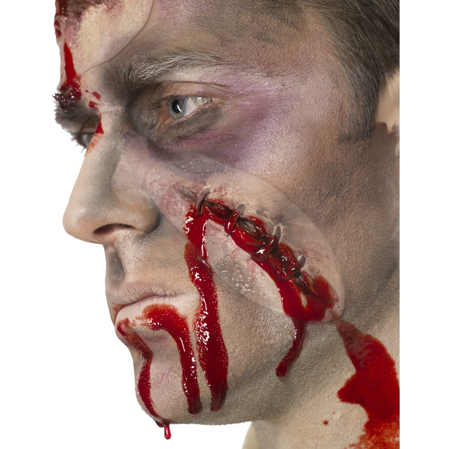 Pour Halloween, pourquoi ne pas faire une entrée spectaculaire avec cette cicatrice placer sur votre joue. Vous pourrez aussi le porter pour le carnaval. Cette cicatrice est ouverte avec quatre agrafes et du sang autour.