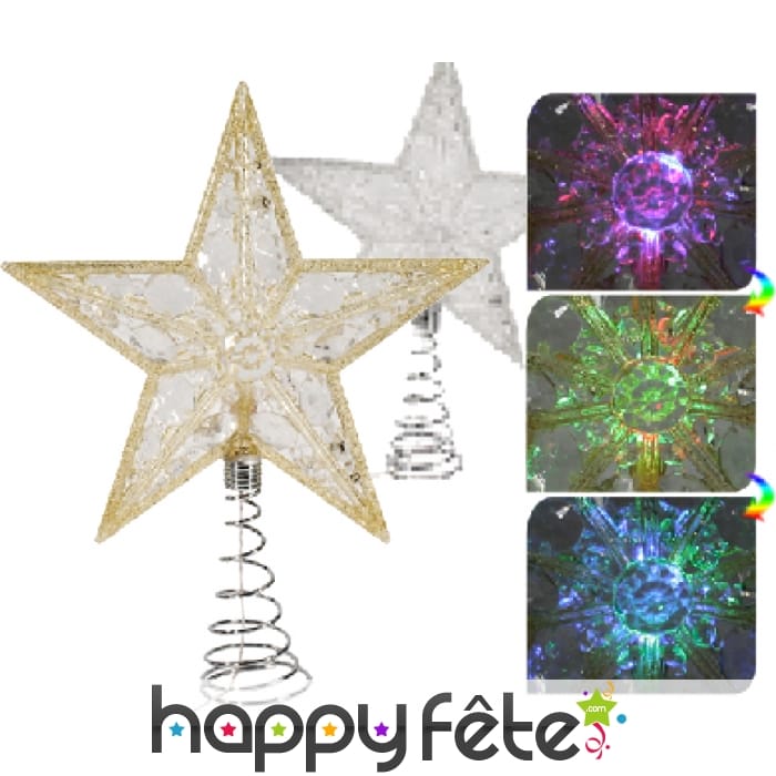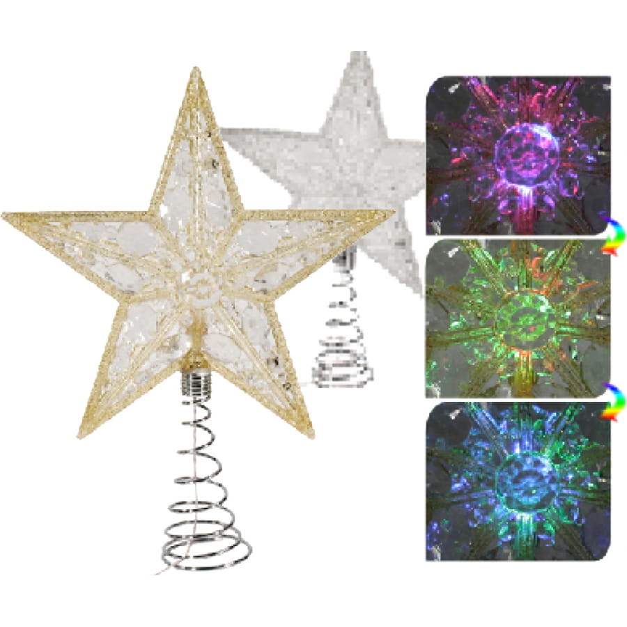 Cimier lumineux multicolore en forme d'étoile de couleur or ou argent.Cet accessoire mesure environ 24 sur 9.5 sur 30.5 centimètres. Ajoutez-le comme touche finale à votre sapin!