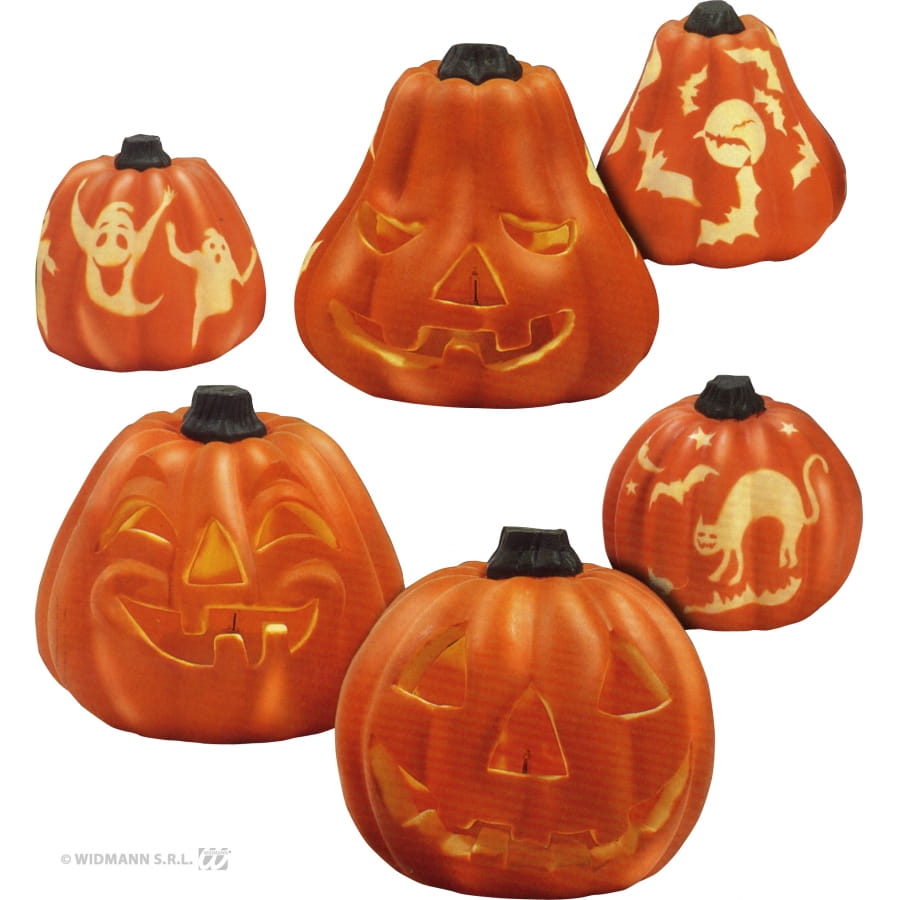 Citrouille orange lumineuse et gravée de décoation, mesurant 16 centimètres et livrée sans les piles. Il en existe 6 modèles dont 3 avec visages et 3 autres avec des motifs de fantôme, de chat noir et de chauve-souris. Au moment de votre commande, vous ne pourrez choisir ni le modèle ni la couleur des citrouilles. Un des modèles présentés vous sera livré.