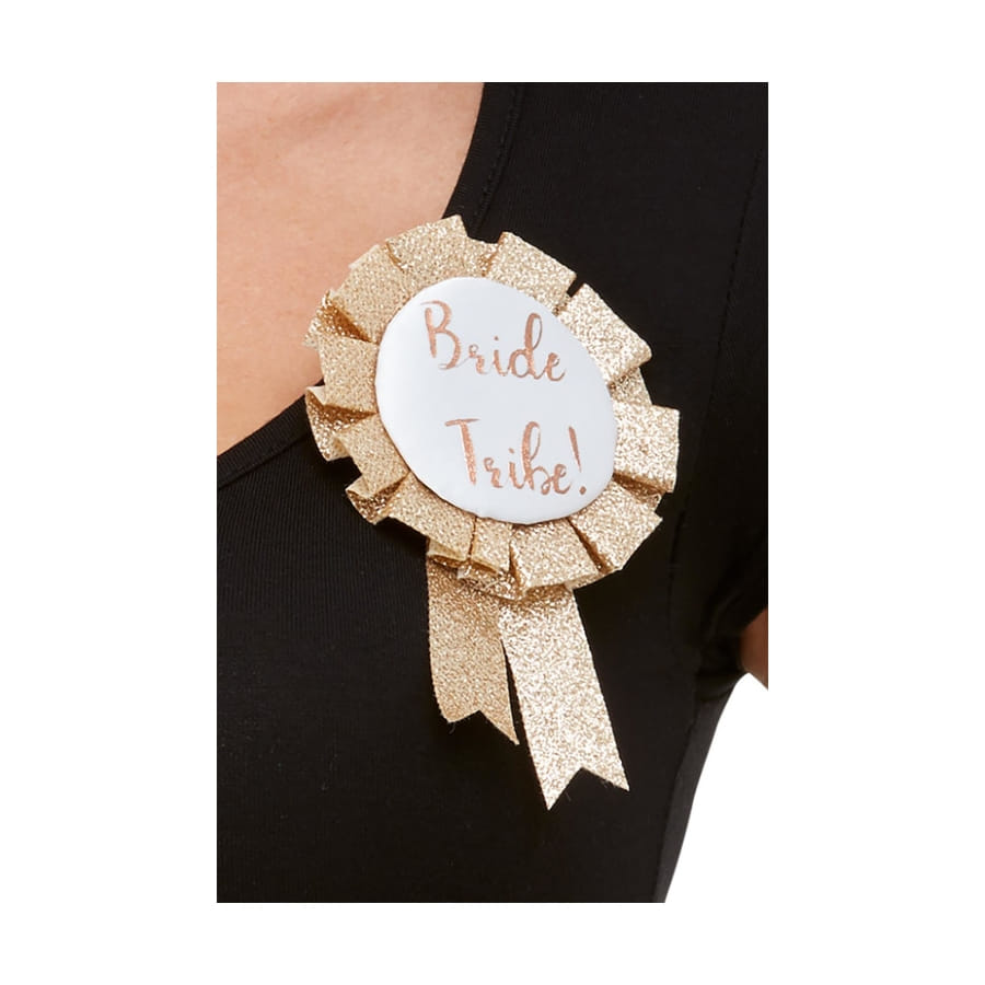Soignez les détails d'un enterrement de vie de jeune fille en habillant les futures demoiselles d'honneur de la cocarde Bride Tribe gold.