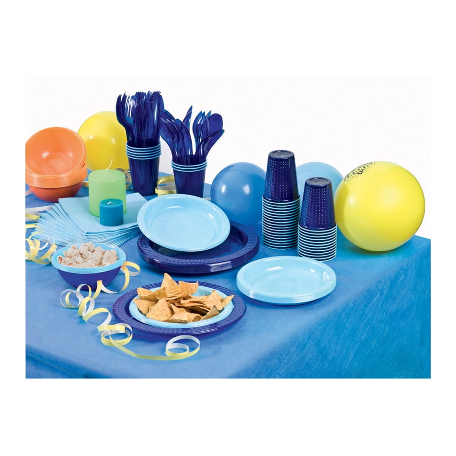 Toute la famille part en pique-nique, pas le temps de se soucier des couverts, tout le monde est pressé de jouir de cette belle journée ! De ce fait, un coffret tout prêt est ce qu'il y a d'idéal. Celui-ci, dans un ton bicolore bleu et bleu ciel, vous conviendra à merveille. Il est composé d'une belle nappe non tissée de 120x180 cm, de 20 grandes assiettes de 215 mm, 20 petites de 175 mm, de 40 gobelets et 40 serviettes ouatées à 2 plis de 33x33 cm, et de 20 sets de couverts de 1.180 mm. Tout y est, non ?