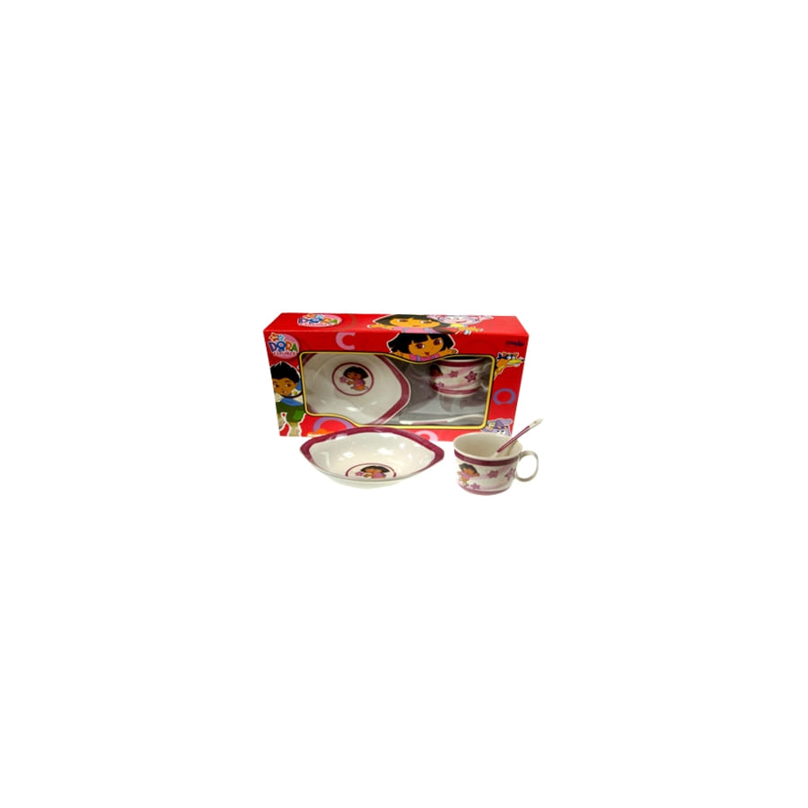 Ce coffret petit déjeuner fera le plaisir de votre fille. Elle voudra prendre son petit déjeuner avec ce set la . De couleur rose et blanc, ce set de petit déjeuner est blanc avec un dessin de dora dessus. Il est composé d'une assiette ainsi qu'une cuillère et une tasse.