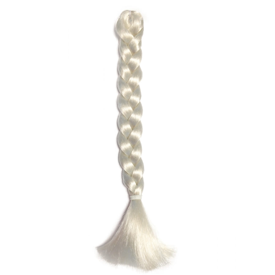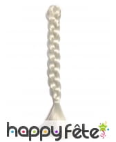 Cette tenue est complétée par une tresse de cheveux synthétiques blancs rassemblés dans une longue natte.