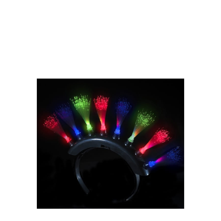 Serre-tête noir, monté de touffes filamentées lumineuses de couleur rouge, bleue et verte, pour homme. Cette coiffe reprend les couleurs de celles d'Indiens d'Amérique. Elle est idéal pour une soirée en boîte de nuit.