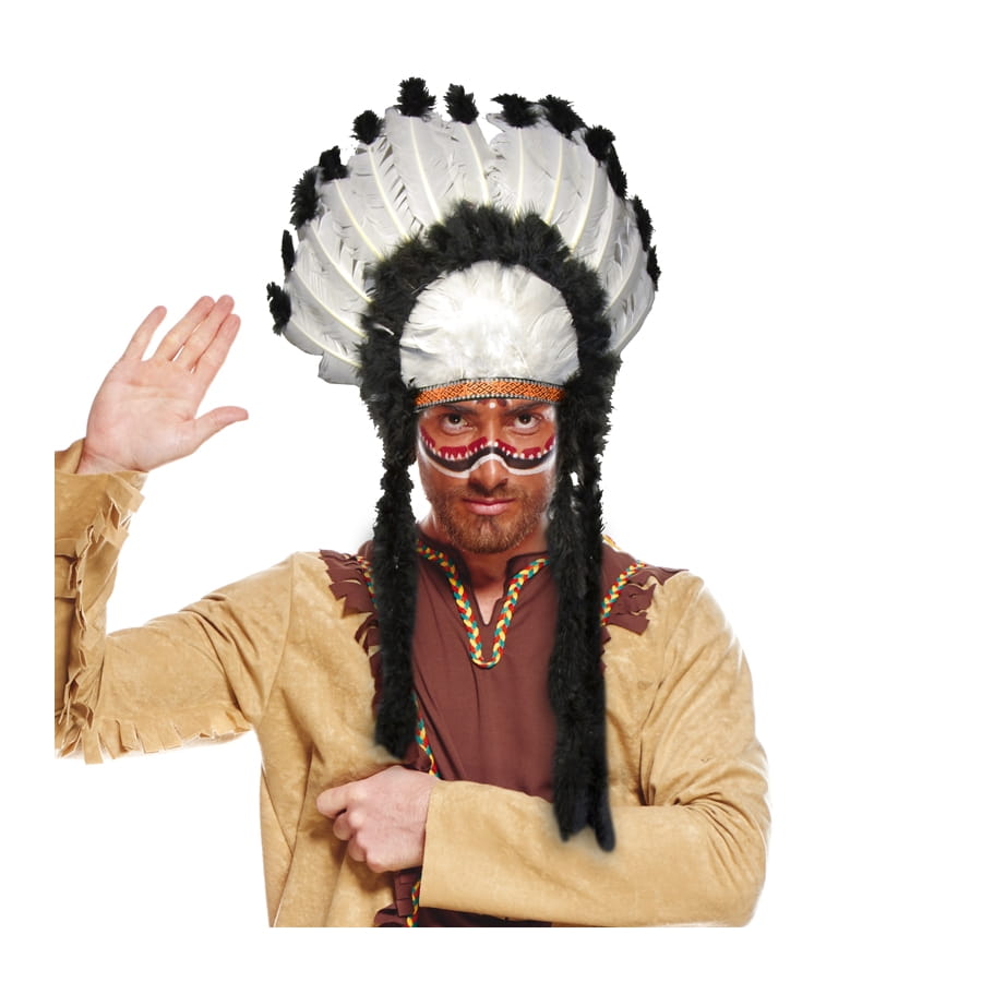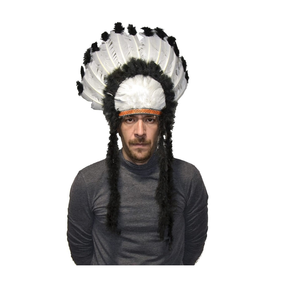 Pour une fois, optez pour un déguisement traditionnel original qui va faire sensation ! Nous vous donnons l'opportunité d'incarner cette fois-ci un grand chef indien. Il s'agit de la coiffe du grand chef Nuage Noir. Elle est superbe avec ses quelques plumes noires et blanches. Réservée à la gente masculine, elle se porte idéalement torse nu avec quelques touches de maquillage de guerrier par ci et par là.