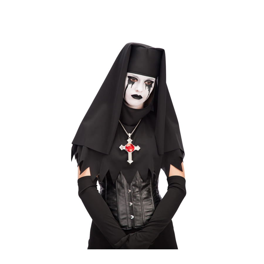 Vous n'êtes pas toujours obligée d'incarner un monstre pour Halloween. Essayez l'option personnage religieux avec cette coiffe de nonne noir intégral. Pour vous Mesdames, cet accessoire de déguisement comblera à merveille un déguisement de religieuse, et pourra aussi se marier avec une tenue gothique. La coiffe est également suggérée pour apporter un côté humoristique à un enterrement de vie de célibataire.