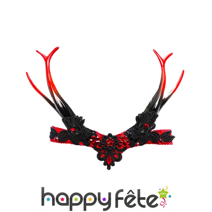 La coiffe est surmontée de faux bois de cerf très bien réalisés, avec de superbes couleurs noire et rouge unies par un dégradé.