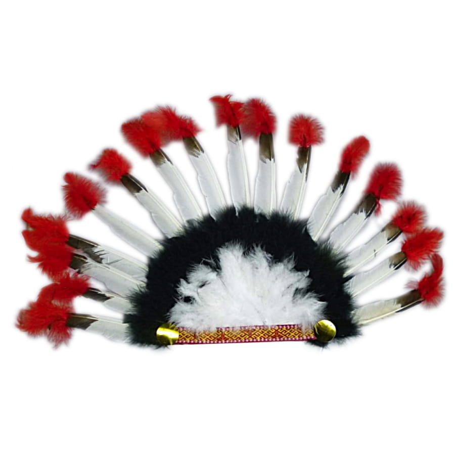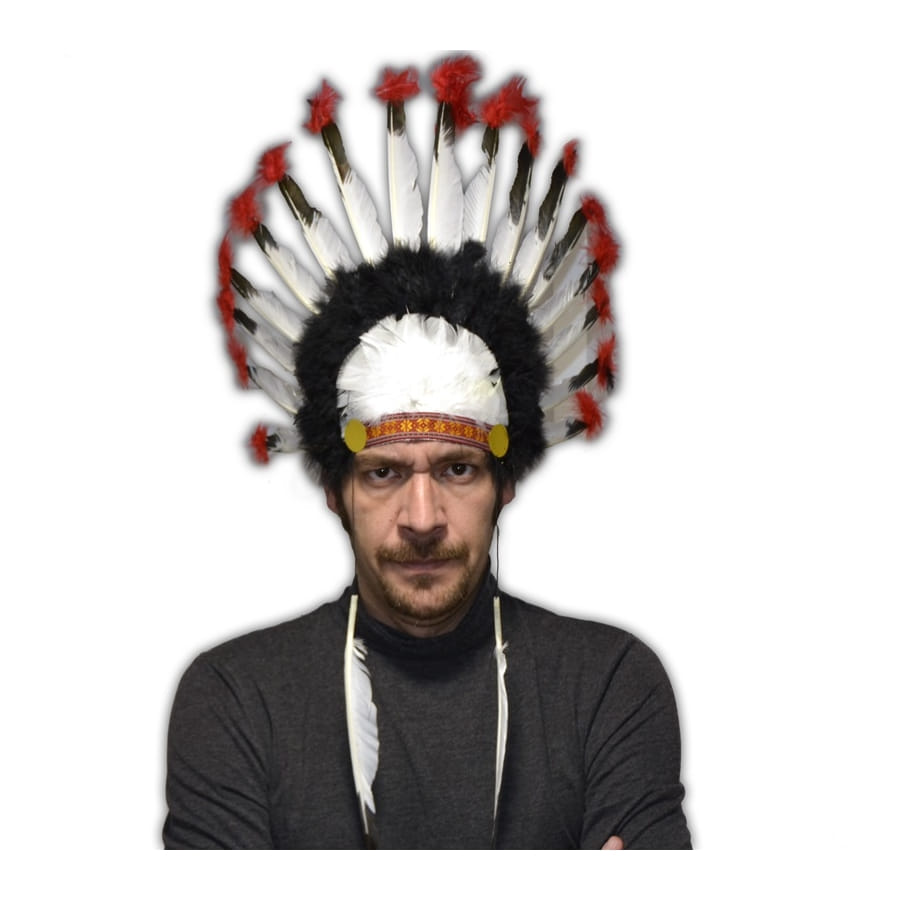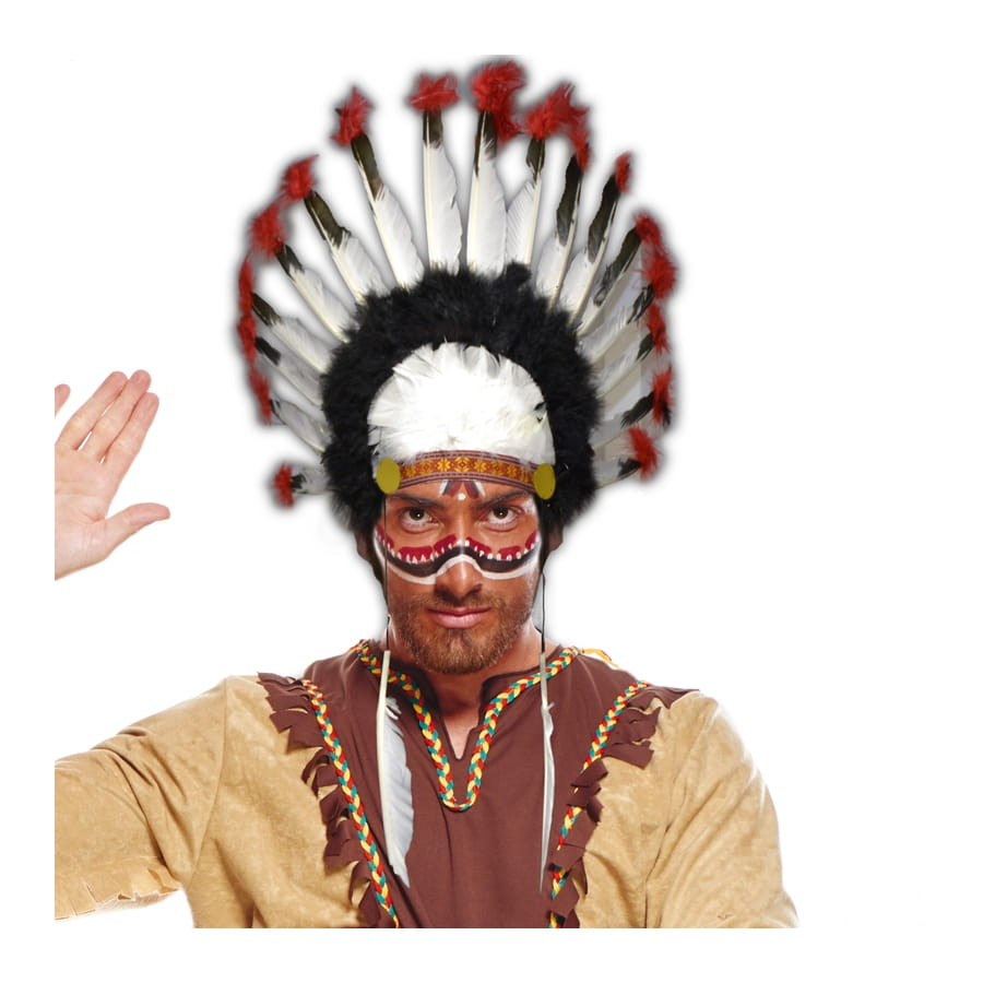 Partez au fin fond des montagnes américaines ! Avec cette superbe coiffe d'indien, vous pourrez incarner sans problème un grand chef guerrier. Vous disposerez d'un couvre-chef orné de plusieurs plumes de couleur blanche, noire et rouge. Pour un effet plus réaliste, rajoutez une touche de maquillage style guerrier à votre tenue, et portez une perruque de guerrier indien. Vous serez impeccable !