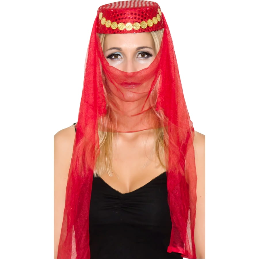 Vous incarnerez à la perfection une danseuse orientale avec cette coiffe de couleur rouge et ornée de paillettes assorties. Cet accessoire est idéal pour compléter un déguisement de danseuse des 1001 nuits.