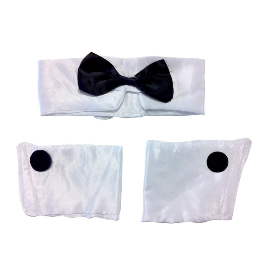 Il est fourni avec deux manchettes blanches en tissu effet satiné, avec un faux bouton en tissu noir sur chacune d'elles.