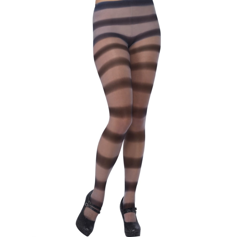 Paire de collants à rayures de couleur grise et transparente, pour femme. Cet accessoire recouvre entièrement les jambes, de la taille aux pieds. Il peut être associé à une tenue de charme pour une occasion romantique ou à un déguisement d'Halloween.