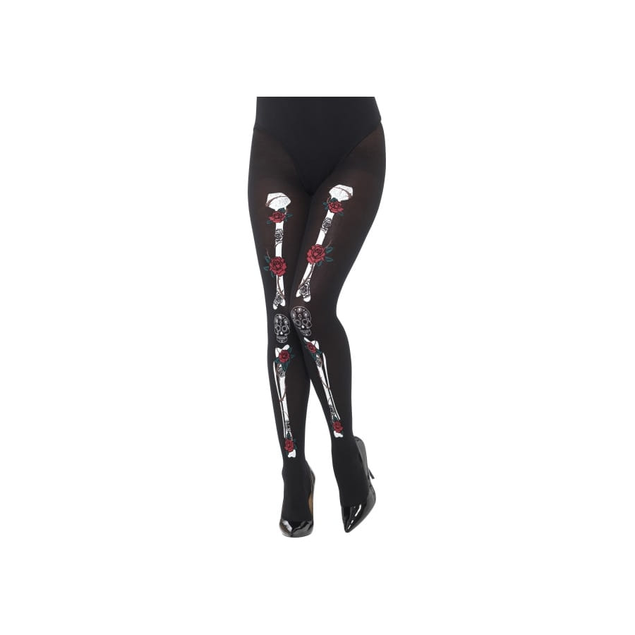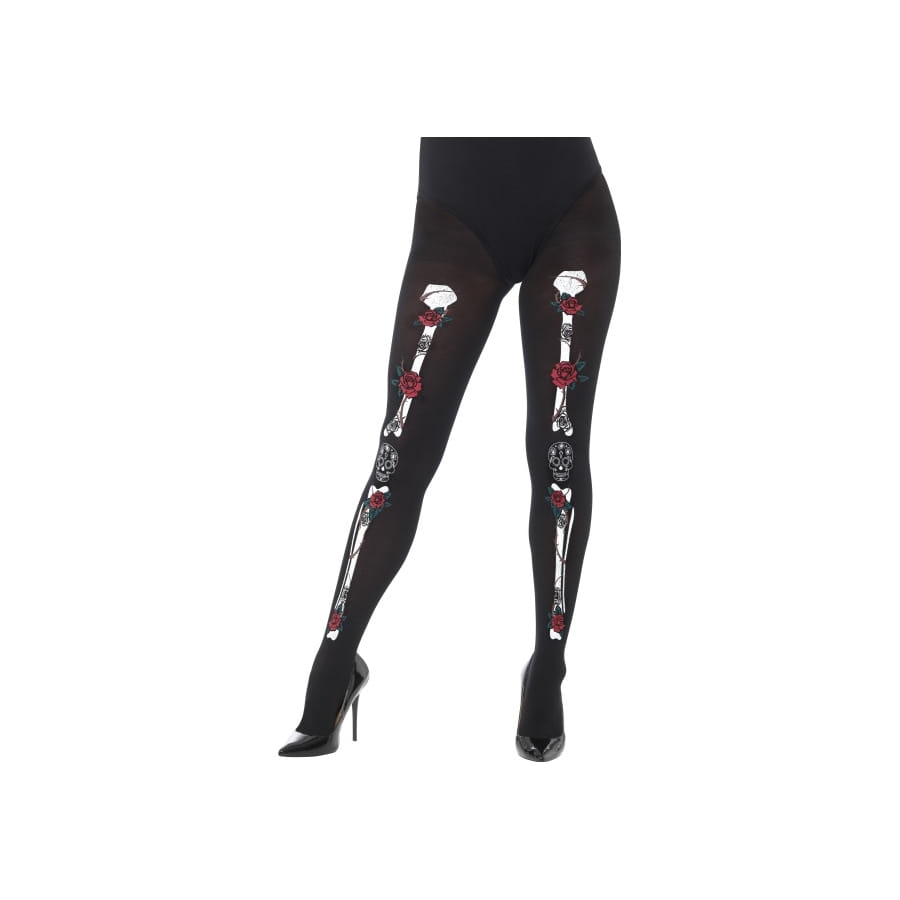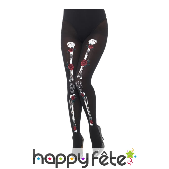 Pour compléter votre déguisement jour des morts, sur happyfete, nous proposons ici les collants opaques jour des morts. Ils sont de couleur noire et ont comme motifs des fémurs et des tibias blancs sur le devant. La paire de collants est rendue moins sinistre avec les roses rouges qui ornent les os du squelette humain.