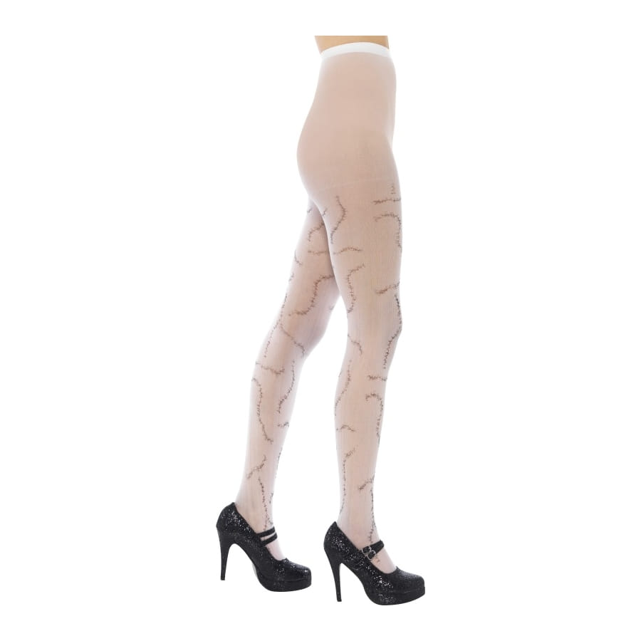 Cette paire de collants est un accessoire idéal pour Halloween. Incrustez-vous dans le rôle d'un zombie et horrifiez vos congénères de la race humaine avec tous les dessins de points de suture représentés sur le collant, ce qui donnera l'impression que vous êtes blessé et raccommodé de partout. Rajoutez-y ensuite une bonne tenue d'Halloween. Les collants sont disponibles en taille unique, de couleur blanche.