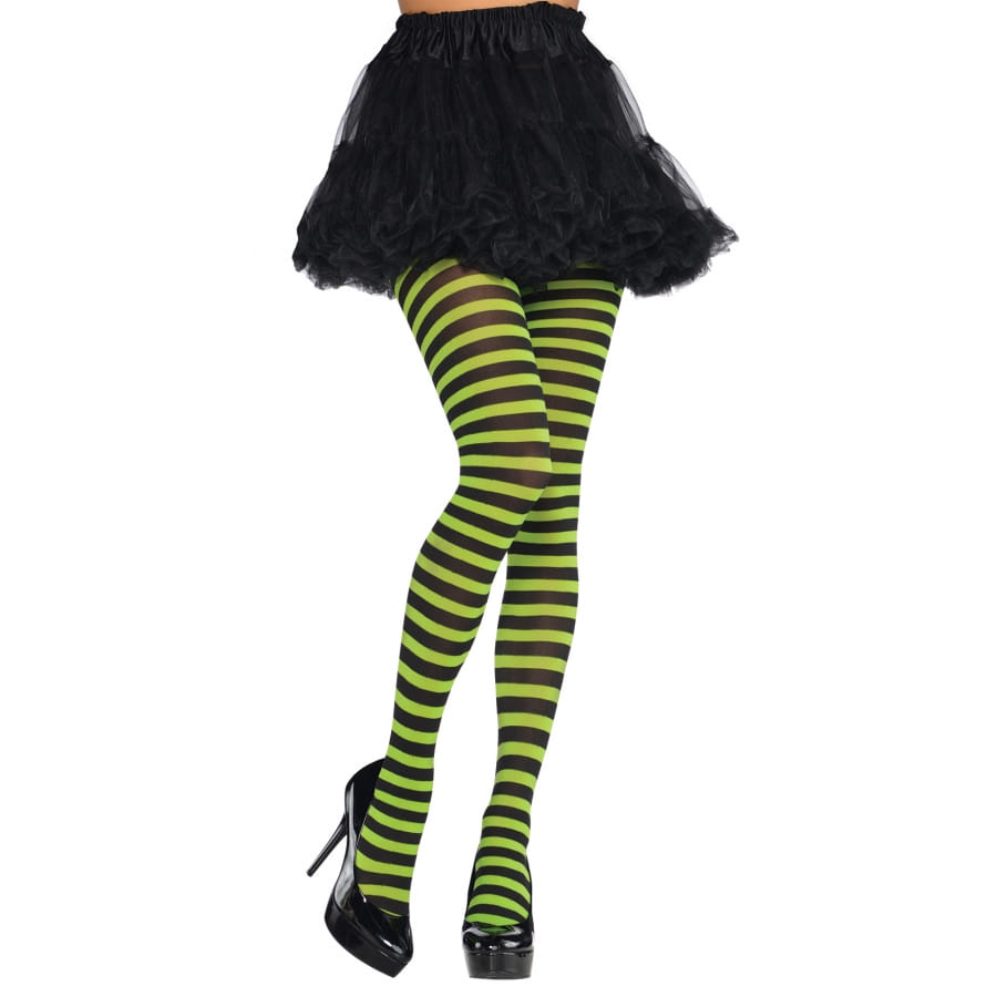 Les collants rayés verts et noirs pour femme sont en polyester et nylon.