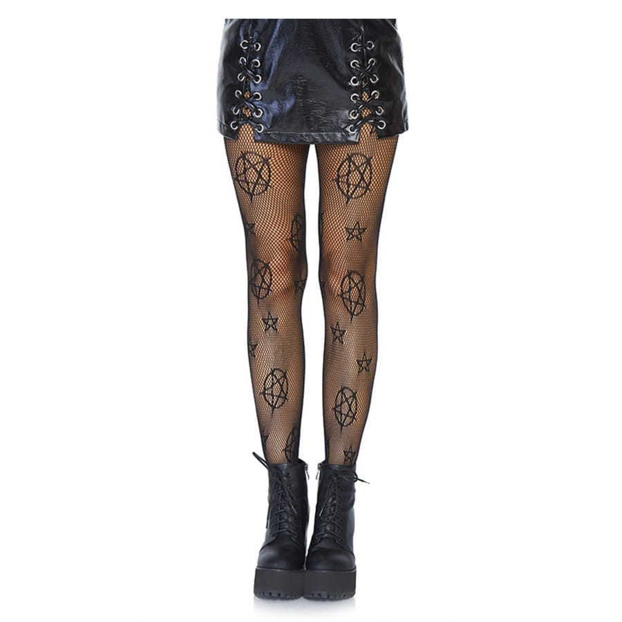 Les collants résilles noirs avec symboles sataniques sont destinés aux femmes.