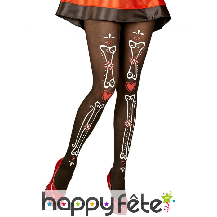 De couleur noir, ces collants sont imprimés sur les jambes des os blancs agrémentés de fleurs et de coeurs rouges.