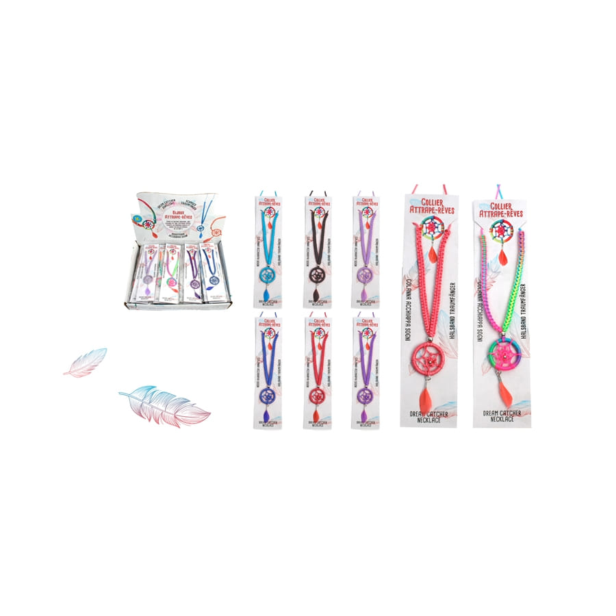 Voici un petit collier dans le style "attrape rêve", décoré d'un pendentif avec plume. la couleur du collier, du pendentif ainsi que de la plume sont assorties. Vendu à l'unité, il n'est pas possible de choisir le coloris lors du passage de commande. Article idéal pour compléter un lot de kermesse.