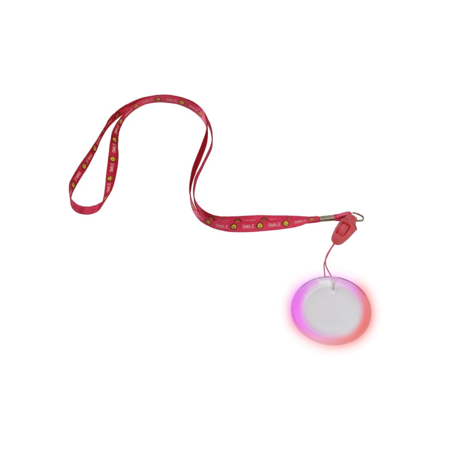 Voici un joli collier avec un pendentif sous forme d'un anneau lumineux et sonore, avec un cordon imprimé de smiley. Nous l'avons créé pour donner du bonheur à vos enfants. Mais il pourra également servir de lot dans des kermesses, ou pour compléter un costume le temps d'un carnaval ou de soirées déguisées.