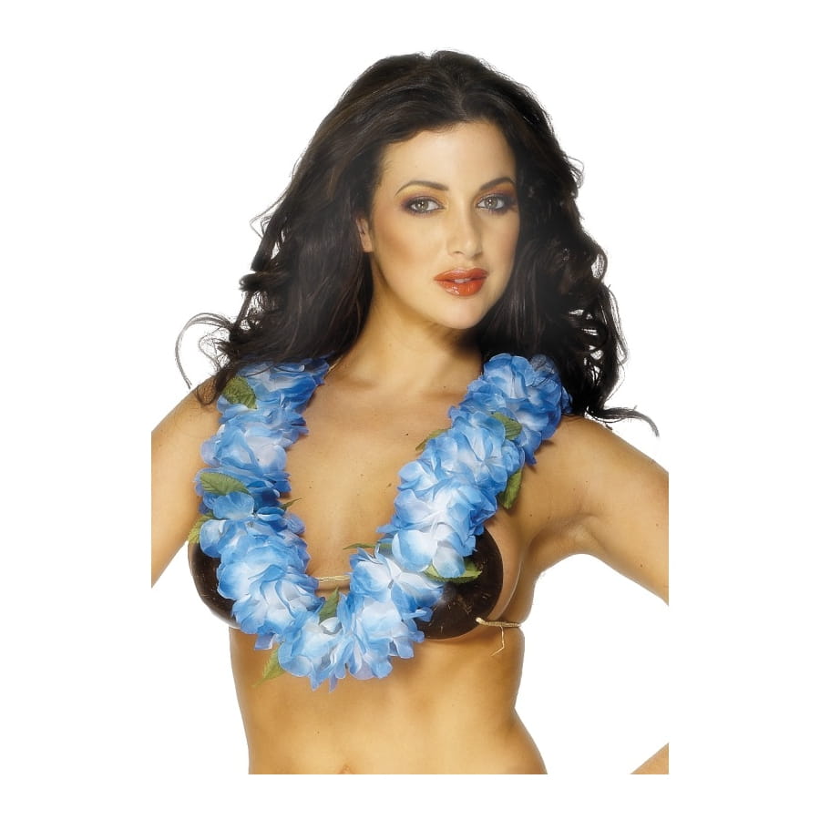 Collier hawaïen pour femme composé de fleurs de couleur bleue en tissu. Ce collier est absolument parfait pour adopter l'allure et la finesse d'une vahiné à l'occasion d'un festival exotique.
